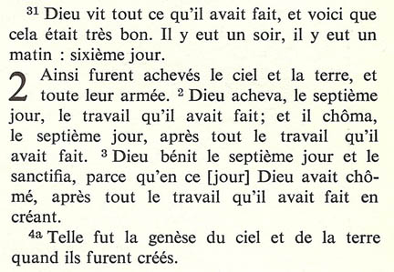 « Ainsi furent achevés le ciel et la terre, et toute leur armée. Dieu acheva, le septième jour, le travail qu'il avait fait ; et il chôma, le septième jour, après tout le travail qu'il avait fait. Dieu bénit le septième jour et le sanctifia, parce qu'en ce Dieu avait chômé, après tout le travail qu'il avait fait en créant.