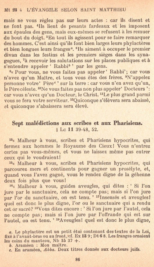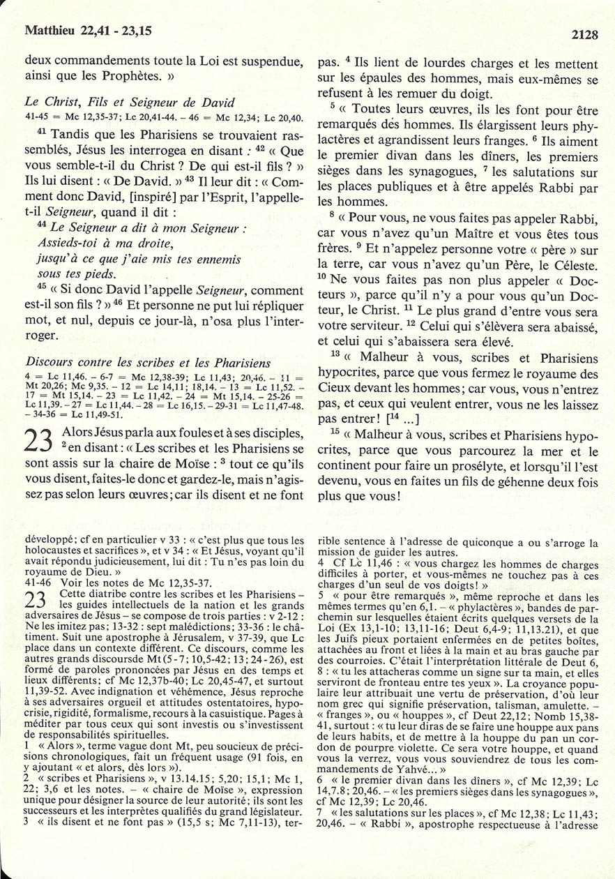 S'il est vrai qu'il y a de la lumière partout, en quantité plus ou moins importante qui peut être recueillie, la grande majorité des Bibles est malhonnête. Les traducteurs ajoutent et retirent autant de mots qu'ils le souhaitent, sans le dire à personne, quand ce ne sont pas des versets entiers. Ils censurent la Parole du Seigneur quand elle dérange leurs visions étroites et ils osent se réclamer de « lui » ! A titre d'exemple, où est passé le verset 14 du chapitre 23 de l'évangile de Matthieu qui se trouve inséré dans les malédictions que Jésus adresse aux scribes et aux Pharisiens hypocrites ? Est-il étonnant que le verset 14 qui a été censuré, soit situé juste après celui-ci :